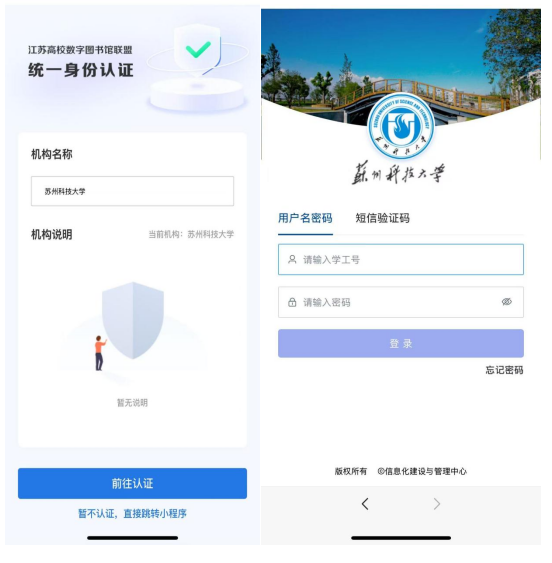 选择所在机构“苏州科技大学”,点击“前往认证”后,进入学校统一身份认证界面,输入账号和密码,确认用户合法身份后,系统将与图书馆系统的用户数据关联认证,关联成功即自动开通。最后进入江苏高校智盟卡小程序,绑定手机号,即可看到认证完成标志。