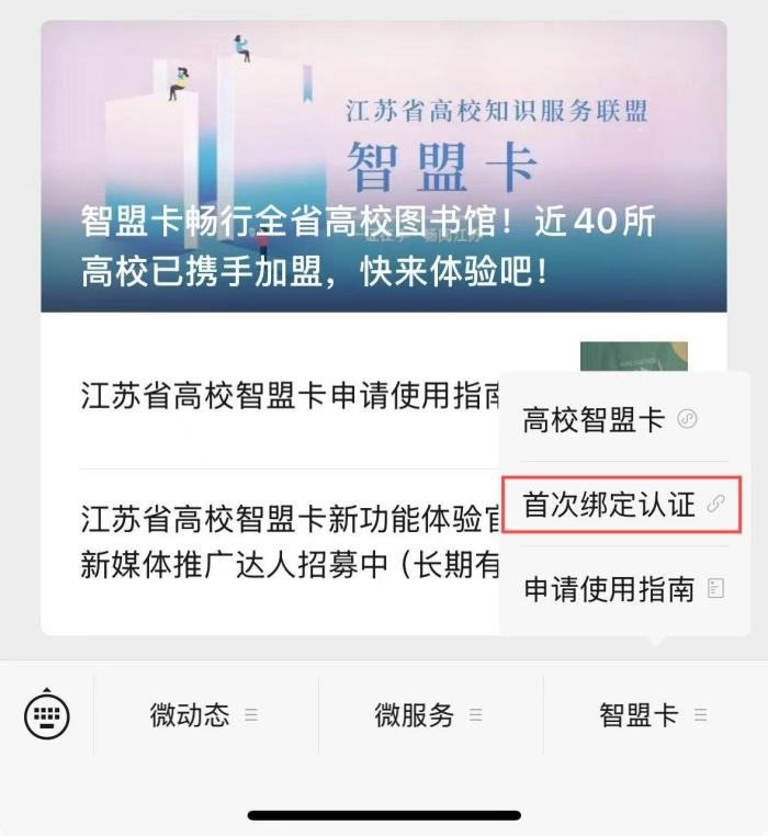 2、点击公众号菜单栏“智盟卡”-“首次绑定认证”